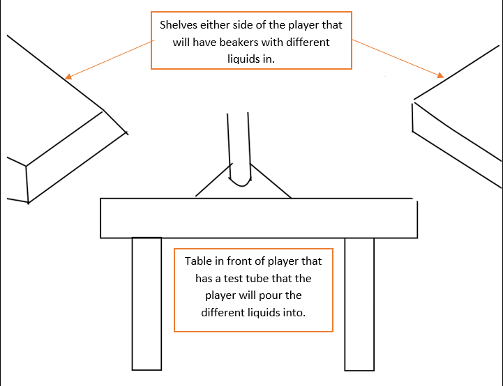 The above screenshot shows a room that the player will be mixing liquids. It will be a small room which will have a Test tube in the table that is in front of the player. This is were the player will have to pour the liquids into. either side of the player are two easily accessible shelve that will have all the beakers that have all of the liquids that can be mixed.